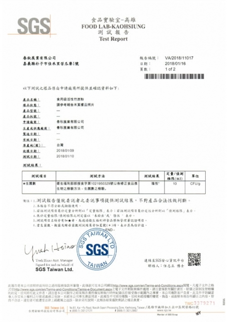 食用級活性竹炭粉、一般用奈米竹炭粉、竹醋液均檢測通過取得檢測報告書,以下是本公司產品送驗單位及檢測項: